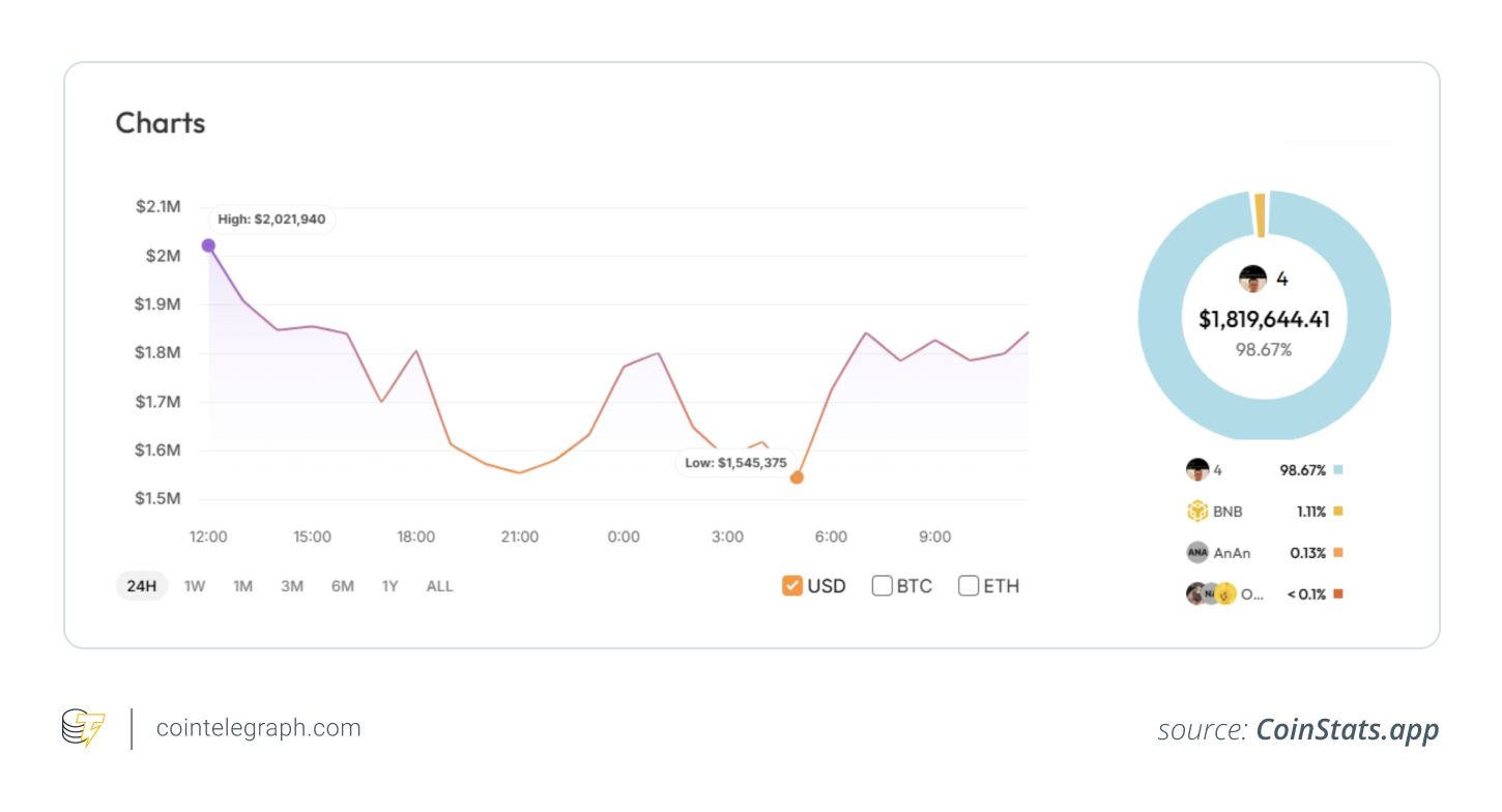 Zincir içi veriler yalnızca hafif bir kar elde edildiğini gösteriyor. Adres, portföyünün %98’inden fazlasını 4’te tuttu. İlk yükselişin ardından 1,88 milyon dolar civarında kaldı. Bu, büyük bir satışta tüm pozisyonu riske atmak ve momentumun devam etmesi halinde maksimum kar potansiyeli sağlamak anlamına geliyordu.