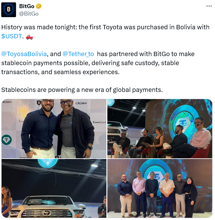 Bitgo, Tother ve Bolivya Toyota ile araba tahtası üzerinde işbirliği yaptığını ve prosedürlerin aksamadan yürümesine izin verdiğini söyledi.